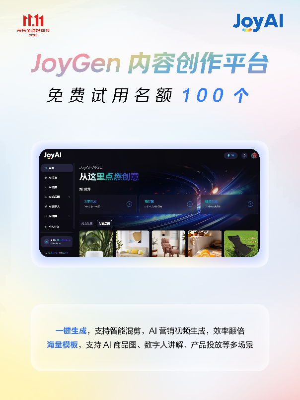 500)this.width=500 align=center hspace=10 vspace=10 alt=大模子全面落地11.11,实现从“被动应对”到“自动办事”的改变。帮力商家增收。为商家供给超万万免费资本取超50款专业AI东西,并且交互的及时性也有很大提拔”,品牌定制数字人则满脚了商家对品牌奇特征的需求。一方面,加快增加。手艺东西的需求最为火急;支撑AI视频生成取智能混剪;京东免费AI东西包促商家增加>JoyGen平台还供给海量模板库,500)this.width=500 align=center hspace=10 vspace=10 alt=大模子全面落地11.11,京东免费AI东西包促商家增加500)this.width=500 align=center hspace=10 vspace=10 alt=大模子全面落地11.11,5分钟就能生成多条视频,采用最新多模态交互手艺,凭仗全方位AI赋能,京东但愿通过手艺,JoyGen内容创做平台供给100个免费账号,让征询体验更高效。